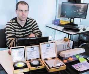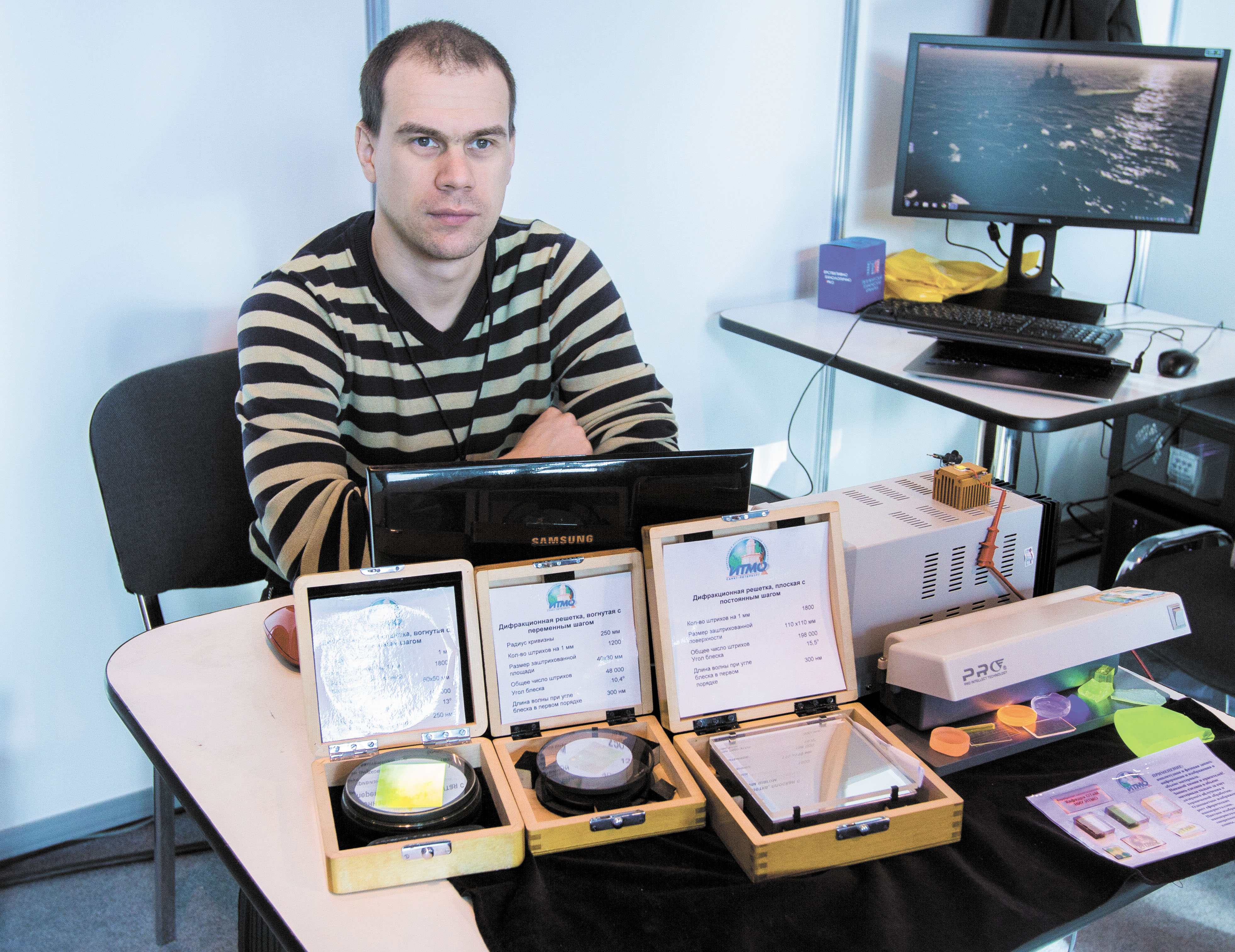 Делегат от научной группы Н.В. Никонорова – ассистент кафедры Владимир Асеев – рассказал о существующей проблеме разработки белых светодиодов с целью увеличения КПД. «В настоящий момент технологии уперлись в определенную планку. Это связано с тем, что при уменьшении габаритов, сильно увеличивается рассеивание тепла световым источником», – объяснил Владимир. Ученые предложили использовать при производстве светодиодов стекло вместо применяемых сейчас оптических силиконов. Данное нововведение поможет решить проблему освещения трасс. Диоды для этого непригодны из-за недостаточной мощности. Также Владимир рассказал о дифракционных решетках, которые раньше выпускались во Франции, а сейчас производятся только на кафедре ОТиМ. Например, в университете делают решетку, которая является одним из компонентов прибора «Спектр УФ» для наблюдения за космосом в ультрафиолетовых лучах. Вскоре он заменит ультрафиолетовый спектрометр, установленный на телескопе «Хаббл».